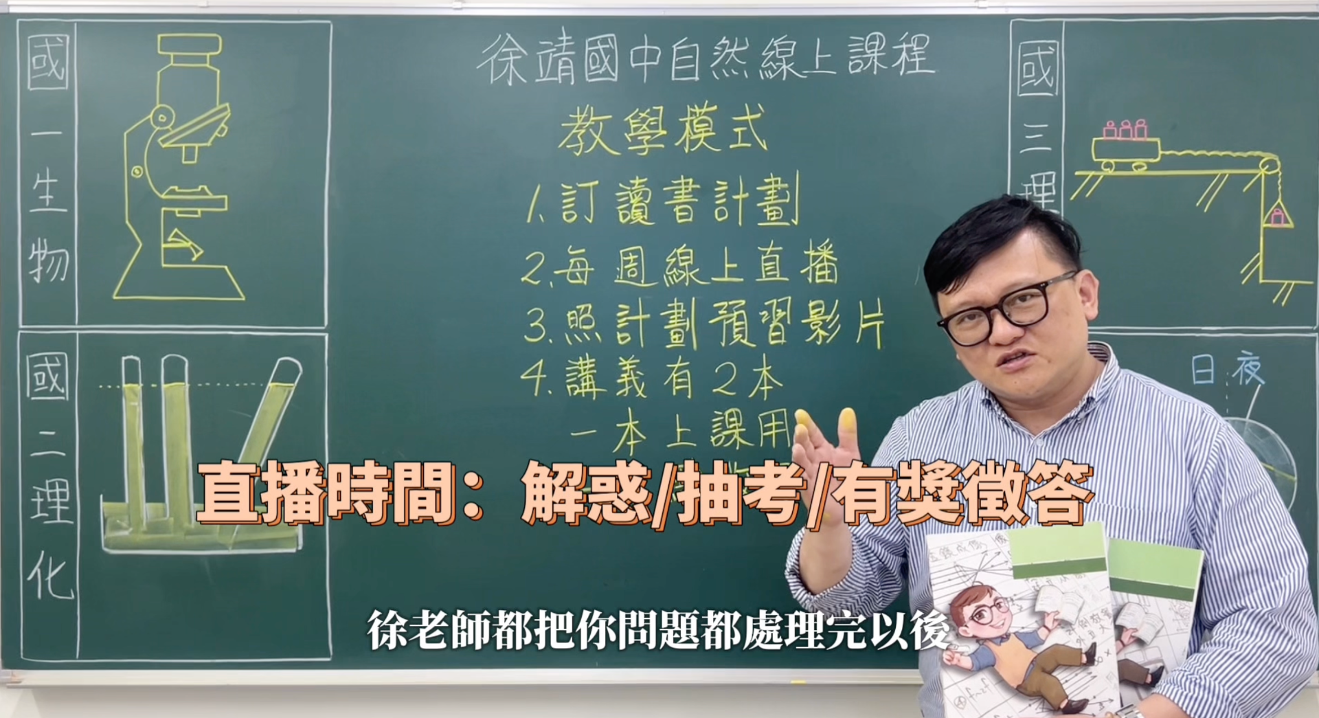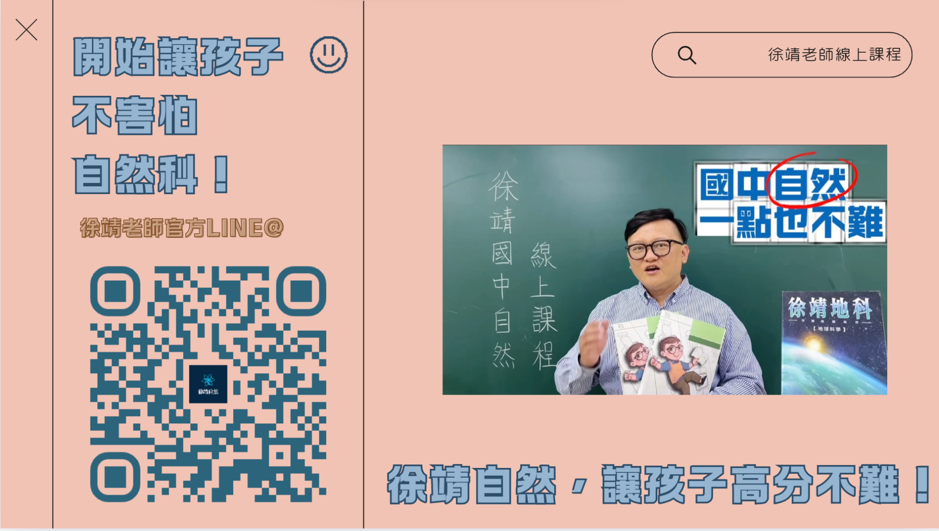 徐靖老師是從補教業基層開始,因此十分了解學生的學習狀況以及會遇到的問題,對於線上課程的驗收和抽考也是非常完整,同學只要跟著徐老師的教學進度,自然科絕對可以進步。