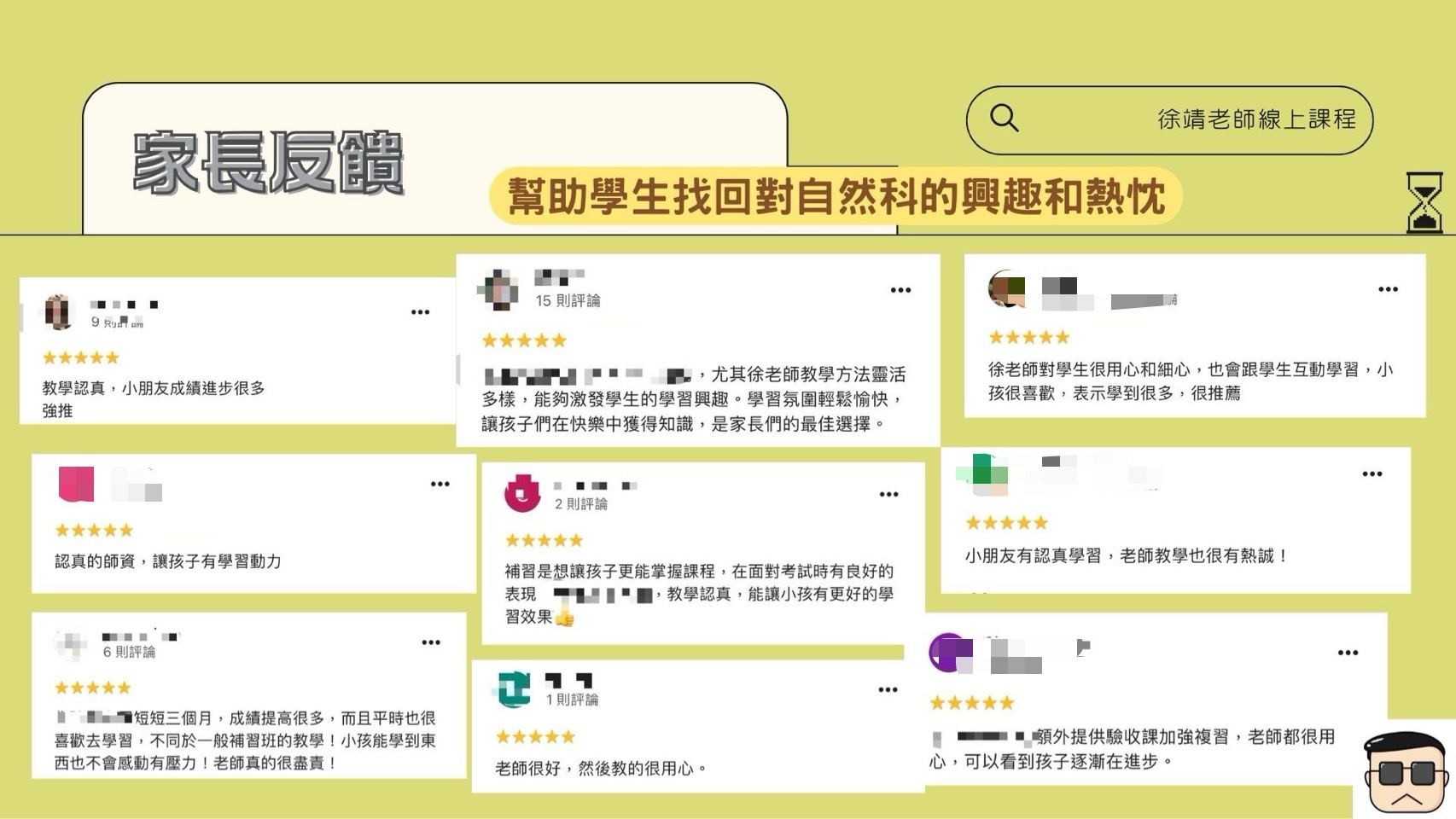 徐靖老師總是想方設法讓同學可以快樂學習讓很多人害怕的自然科學,課程中會有很多有趣的環節,讓同學覺得自然是生動有趣的🧬。